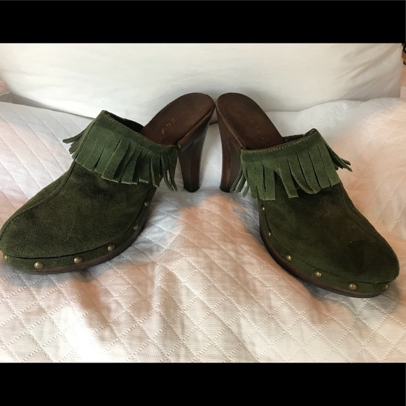 Green heeled clogs with fun fringe and stud detail