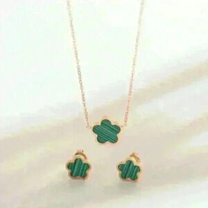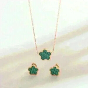 This charming jewelry set includes a delicate necklace and matching earrings, each featuring a clover-shaped pendant inlaid with green striped detailing. The set is gold offering a perfect balance of modern elegance and playful style, ideal for adding a pop of color to your everyday look