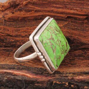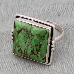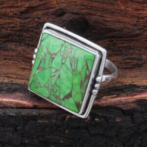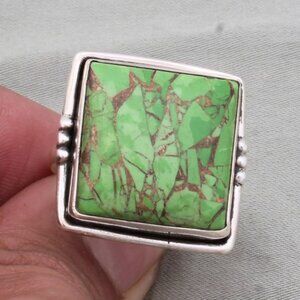 Green Copper Turquoise Ring: Square Boho Sterling Silver Ring