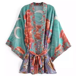 Gorgeous green multi colored floral cosmic bohemian galaxy printed short kimono robe with vented sleeves.