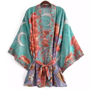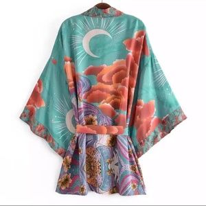 Gorgeous green multi colored floral cosmic bohemian galaxy printed short kimono robe with vented sleeves.