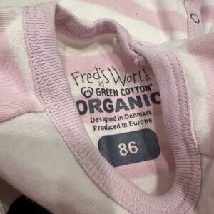Fred's World by Green Cotton romper size 86 (18 months). Light pink and creamy white stripe romper with snaps along legs featuring white bunny appliqué with floppy ears on front. So cute and fun for Easter & spring! Very good condition.