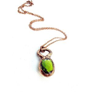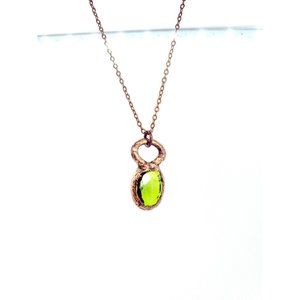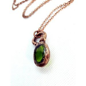 A cute little faux green glass crystal that has been copper-plated and crafted into a pendant hung from a bright copper chain.
