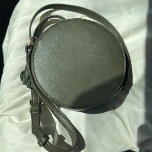 This bag features a circular design with a green cut-out stitch exterior made of high-quality suede material. It comes with a tassel accent, a green strap, and a zip closure for added security. Like New, no tag.