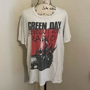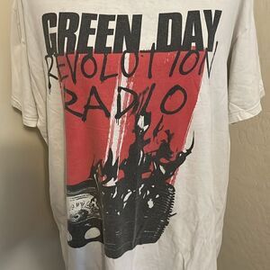 Green Day Band Revolution Radio White Graphic Shirt Casual Music. Size XL, please note; has signs of wear and stains. View all photos for best representation.