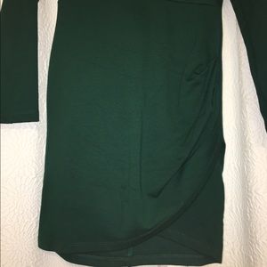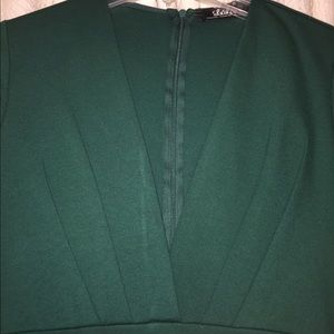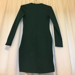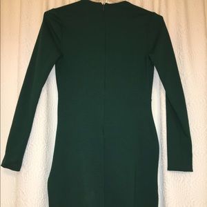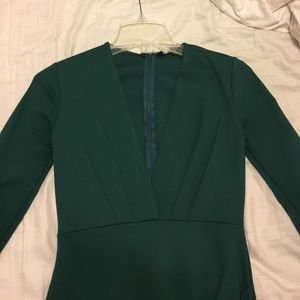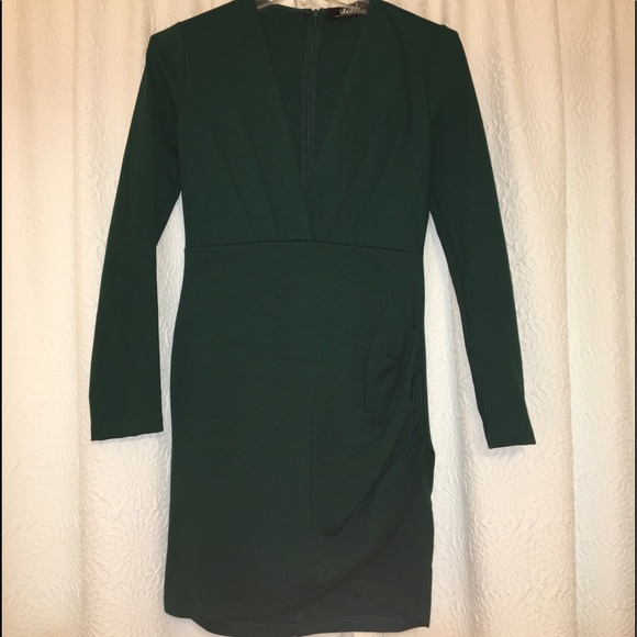 This dress is great for anything from cocktail parties to a night out with your friends. This dress features a plunging neckline, long sleeves, and tapered fabric on the top part and bottom right.