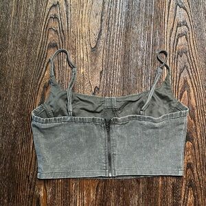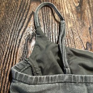 Denim cotton material. Sewn in structured bra cups with polyester lining for comfort