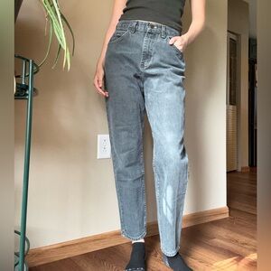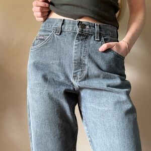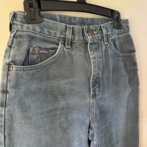 Vintage denim Rider jeans. These are high waisted and have a gorgeous dark, worn in green color! Size 8P (model is 5’7” for reference)