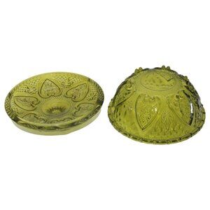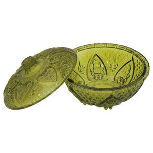 Green Depression Glass Lidded Candy Dish With Intricate Embossed Pattern