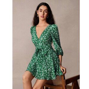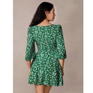 Green Ditsy Floral Print Mini Dress V-Neck Ties 3/4 Puff Sleeve Fit & Flare