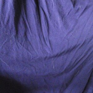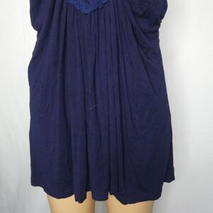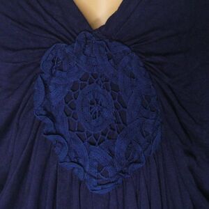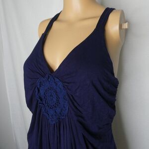 Beautiful dark blue tank with draped front, crocheted applique at the bust, and crossed straps in the back. It has some fuzzies/pilling but is overall in great condition.