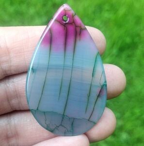 This stunning agate teardrop pendant features a blend of vibrant colors of green and pink. Perfect for jewelry making and crafts.