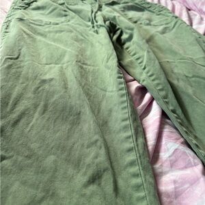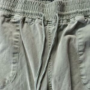 Stretchy waist and ties in the front. Lightly worn but no major flaws noticed.