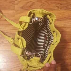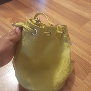 Small lime green drawstring / bucket bag. Width- 8 1/2 inches. Length 9 inches. Interior black and white stripe pattern with two pockets, one with a zipper. Crossbody strap included as shown in photo.
