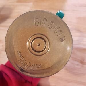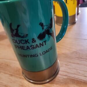 Vintage shotgun shell-style beer mug featuring "Green Duck & Pheasant Hunting Loads" branding. Bold red body with gold-tone rim and base, made from durable plastic. Designed to resemble a large shotgun shell—ideal for hunters, collectors, or themed bar décor.