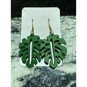 Green Earrings Wooden Boho Tropical Laser Cut Lightweight Dangle Gold hook NWOT