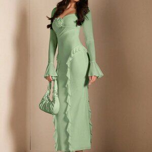 Green Elegant Women's Long Sleeve Floral 3d Decorative Ruffled Dress