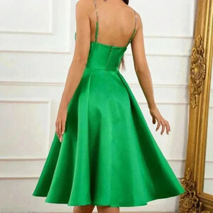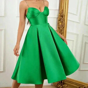 Green Elegant Women's V-Neck Pleated Tulle Dress With High Waist