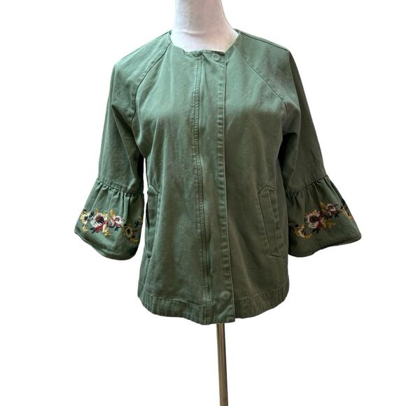 Olive green jacket that exudes effortless style. Standout features include embroidered floral details on the bell sleeves and a lightweight design perfect for spring or summer. It features a round neckline, front zipper closure with snap buttons, and a relaxed fit.