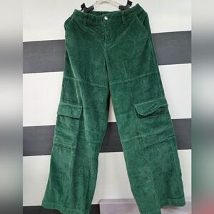 Stylish green corduroy cargo pants. Features multiple pockets and a relaxed fit.