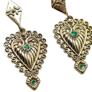 Vintage gold tone earrings featuring green enamel hearts. These dangle drop earrings have a post back closure, adding a classic touch to any outfit.