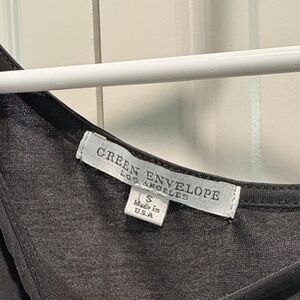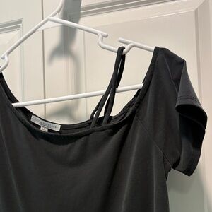 Chic black top with short sleeves. Features a unique neckline. Ideal for casual wear.