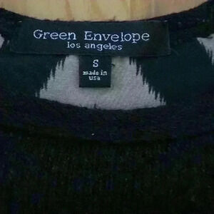 Green Envelope Black Sweater with Tan and Black Pattern V Back Detail
