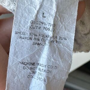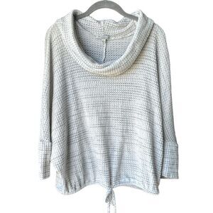 Comfy cowl neck lightweight sweater/long sleeve shirt. Waffle knit style with a cinched hem and tie in the front. White and gray combo. Excellent used condition. Size L.