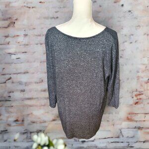 Great gray with white marbling long sleeve sweater. It has a scoop neckline with a zipper in the front. The back is longer than the front. Great with jeans or black slacks.