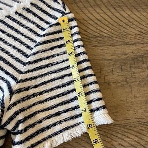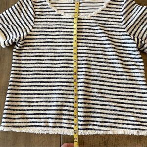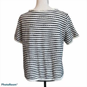 Features: Scooped neck with fun shaggy trim on neckline, sleeves and bottom edge. Stripe is woven into the shirt. 100% Cotton. Black and White.