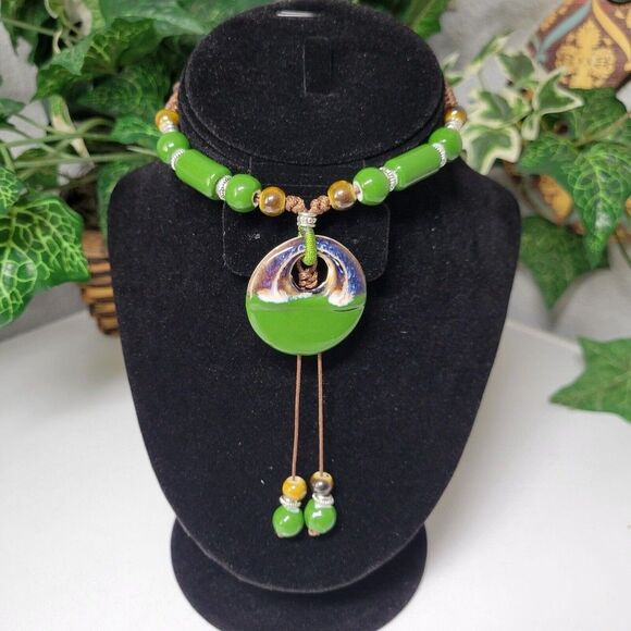 Beautiful Green Ethnic Necklace in Earth Colors, made of Ceramic Beads with brown adjustable lace.. Fashion Necklace in Bohemian style. *NEW*