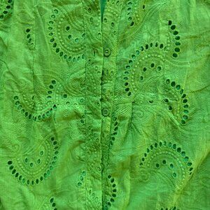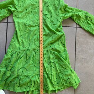 Bright green mini dress featuring an all-over eyelet embroidered paisley pattern. Button-down front with long bell sleeves and a tiered hem for a flowy look. Lightweight and partially lined for comfort. Perfect as a casual summer dress or a chic beach cover-up.
