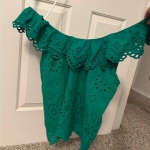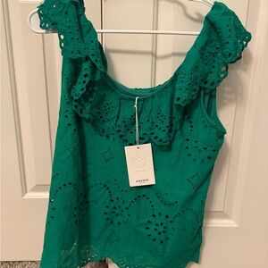 Elevate your style with this chic green eyelet ruffle top. Perfect for any occasion, this top adds a touch of elegance to your wardrobe. New with tags! 100% cotton. Can be worn as a tank or off shoulder.