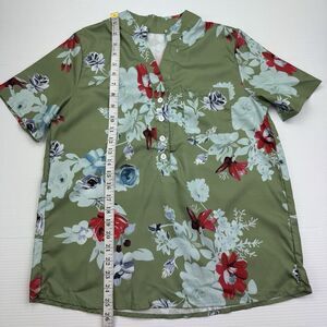 Green Floral Blouse Size Medium V Neck Buttons Short Sleeve Printed Lightweight