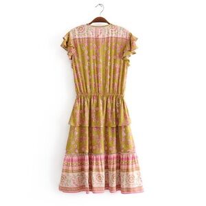 Beautiful bohemian floral printed green and pink retro tiered ruffle mini dress with short sleeves, button front and waist tie.
