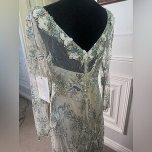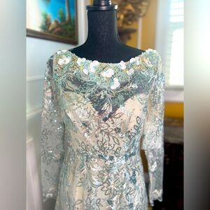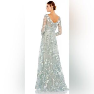 Green Floral Embroidered Illusion Long Sleeve Gown