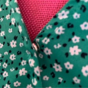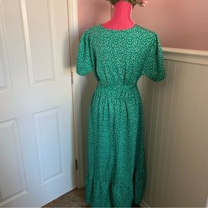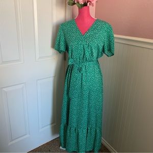 Green Floral Maxi Dress Short Sleeved, Belt Accent, Modest Cut, size Large