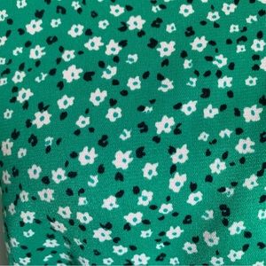 Green Floral Maxi Dress Short Sleeved, Belt Accent, Modest Cut, size Large, perfect condition, ruffle on bottom of skirt, 42” bust to hem