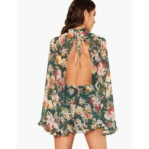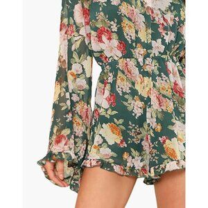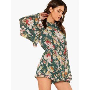 Green Floral Print Chiffon Ruffle Long Flare Bell Sleeve Romper Playsuit Dress