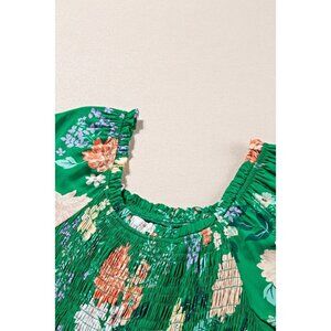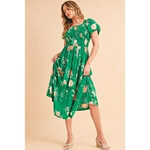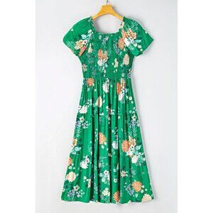 Green Floral Smocked Puff Sleeve Midi Dress For Women
