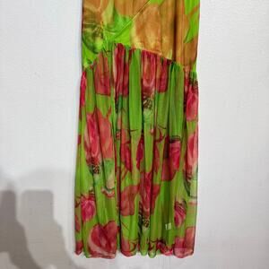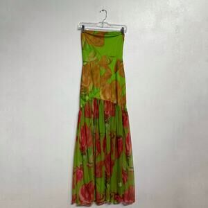 Green Floral Strapless Backless Sheer Mesh Side Slit Maxi Dress Sz S