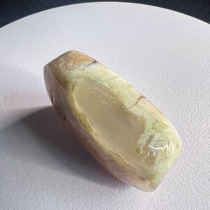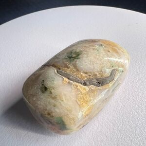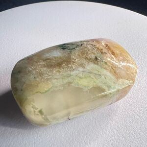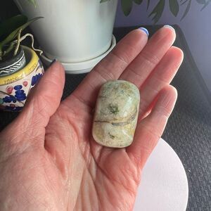 A green flower agate rectangular palmstone features soft, floral patterns resembling blooming flowers within a vibrant green hue. Known for its heart-healing energy, it promotes emotional balance, encourages self-growth, and fosters tranquility. This stone is ideal for personal transformation and nurturing inner peace.
