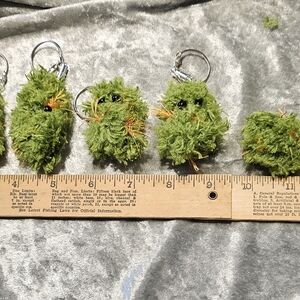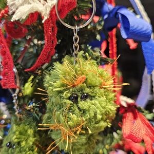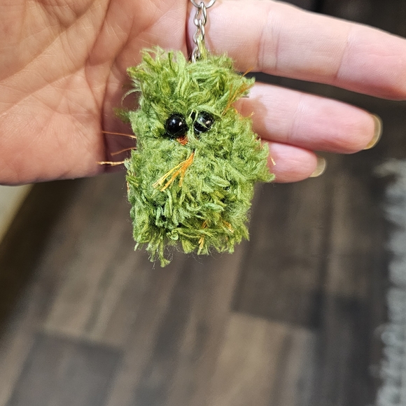 Cute green fuzzy keychain with black eyes. Perfect for adding a playful touch to your keys. I come with a polymer clay glow-in-the-dark charm.