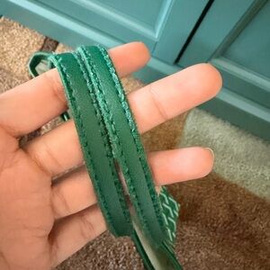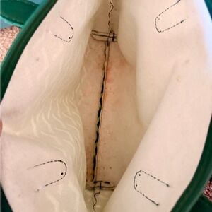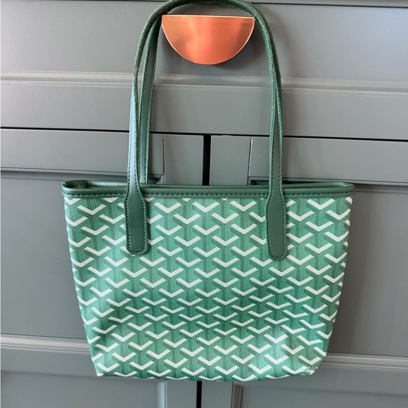 Chic green tote with geometric design. Ideal for daily use. Inside picture shown its usec and cleaning
