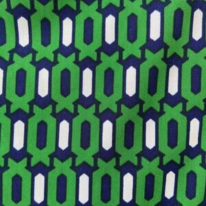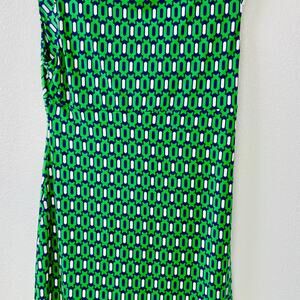 Eye-catching dress featuring a vibrant green geometric print. This sleeveless dress showcases a flattering V-neckline with a unique twist detail at the center. The bold, retro-inspired pattern combines green, navy, and white for a stylish look. It's fully lined with a solid blue fabric.