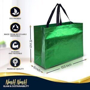 BRING ON THE SHINE – Featuring a green glossy surface with a metallic shine, our large gift bags create beautiful reflections under different light conditions and are perfect as party bags, birthday gift bags, Christmas bags for gifts, goody bags, Christmas bags, etc. REINFORCED BOTTOM – Each of the 15.5(W)x 6(D) 12"(H) large gift bags has a cardboard insert to prevent the bottom of the bag from curving and maintain the tote bag shape when it's empty. GO PAPERLESS – Our reusable gift bags are made from a non-woven fabric called Polypropylene ( the same material reusable bags in supermarkets and stores are made from). These are not your generic old paper gift bags but a new breed of gift bags designed for those who seek to combine glam and sustainability. ECO-FRIENDLY GIFT BAGS- teamed up with renowned non-profit "Climate Partner" to offset all carbon emissions associated with the entire life cycle of our products. Now, you can enjoy gifting by using gift bags that are not just beautiful and reusable but are also 100% carbon neutral.