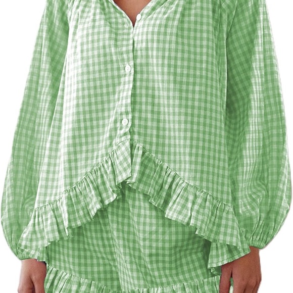 Chic green gingham set with ruffle details. Perfect for casual outings.