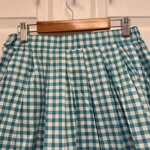 Elevate your wardrobe with this chic green gingham skirt. Perfect for any occasion, this skirt offers a blend of style and comfort. Side sipper with buttons, pleats, pockets and elastic waistband