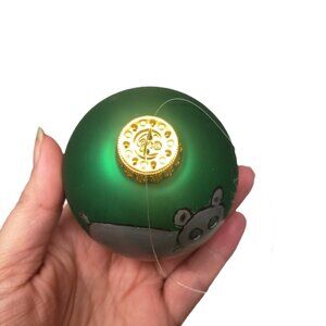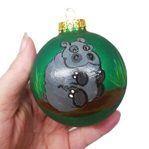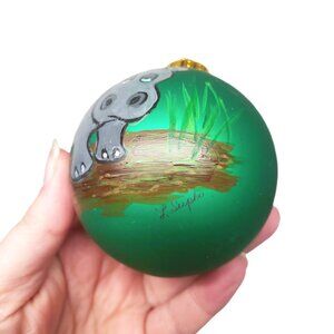 Green Glass Hand Painted Hippo Christmas Ornament Ball Set Lot x3 L. Supko