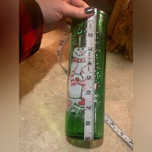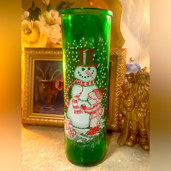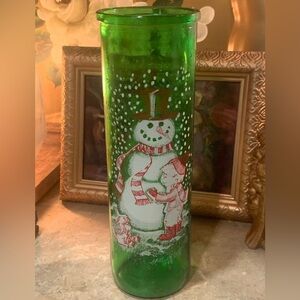Green Glass Jar For Christmas Candle Boy Building Snowman And Dog Watching 70’s